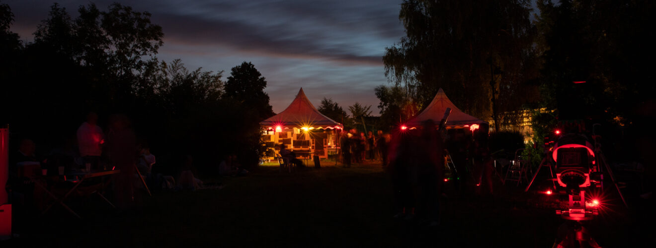 L’entrée de l’aire d’observation est délimitée par les deux barnums, l’un pour la mythologie et les constellations, l’autre pour le maniement des instruments. Sur le devant l’expo SOLEIL