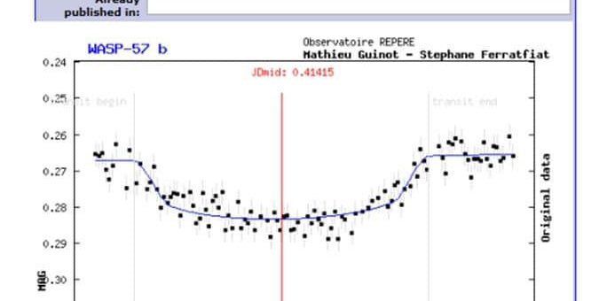 Etoile visée : WASP-57, nom de l’exoplanète : WASP-57 b. Les données ont été recueillies par Mathieu Guinot et Stéphane Ferratfiat....