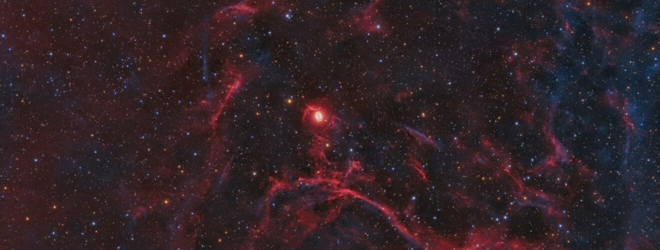 « La nébuleuse planétaire Caldwell 02 entourée du vestige de Supernova CTA 1 dans la constellation de Cephee. 42h de poses de mars à mai (le rémanent est extrêmement faible, invisibles sur les brutes de 300s d’où ce temps de pose conséquent). »