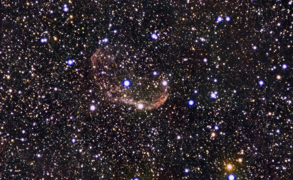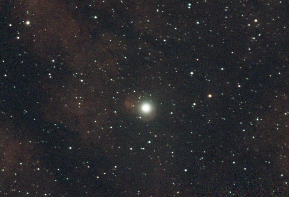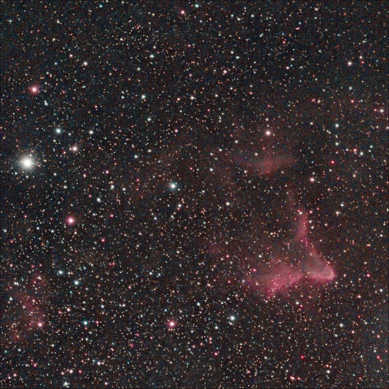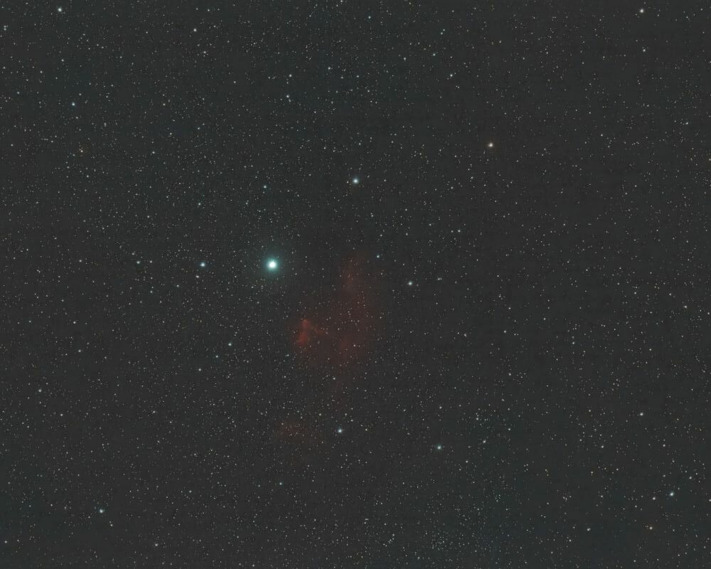 Voici Gamma Cassiopeiae et son fantôme. Baptisée Navi en anagramme de son deuxième prénom par Virgil Ivan Grissom, lequel n’eut guère le temps de profiter de cet honneur (Apollo I). « L’ectoplasme » IC63 est un nuage d’hydrogène ionisé par le rayonnement ultraviolet de l’étoile, pourtant distante de 4 années-lumière (!), étoile d’une masse égale à 17 Soleils. Le tout est à 550 AL de nous.