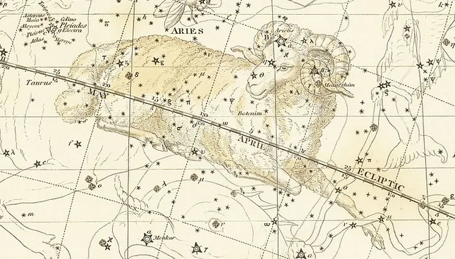 Elle avait la caractéristique dans les périodes anciennes d’être la première des constellations du zodiaque (époque où le début de l’année était fixée au 1er avril). En effet, il y a 2000 ans, le Bélier était l’endroit où se situait le point vernal de l’équinoxe, un des deux points de croisement de l’écliptique et de l’équateur céleste que croise le soleil lors de son mouvement apparent. Avec la précession des équinoxes, ce point est aujourd’hui situé dans la constellation des Poissons.