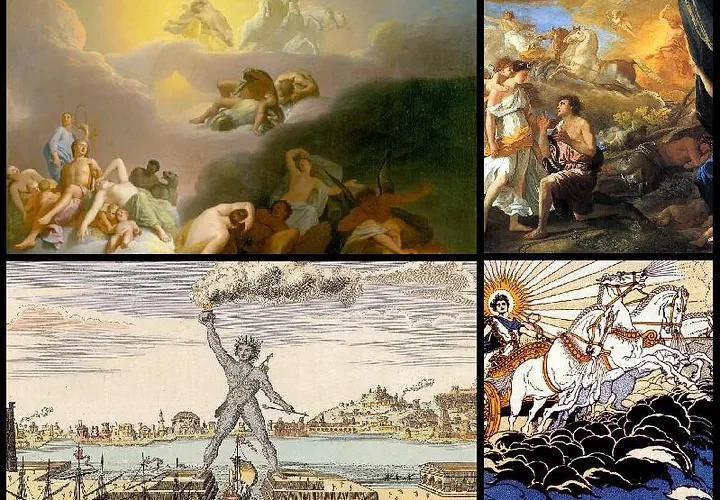 Oublié lors du partage du monde entre Zeus, Poséidon et Hadès, il alla se plaindre directement auprès de Zeus. Qui, en compassion, lui offrit l’île de Rhodes qui venait d’émerger de la mer (le colosse de Rhodes était la représentation d’Hélios).