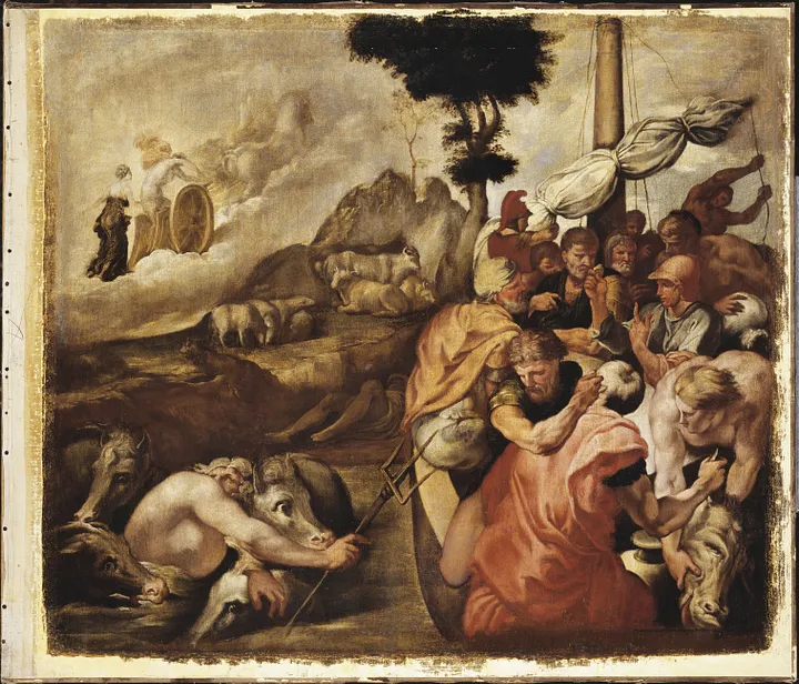Tenaillé par la faim au bout d’un mois sans pouvoir quitter le rivage pour cause de vents contraires, Euryloque et les autres compagnons font alors abstraction des craintes d’Ulysse et profitant de son sommeil,