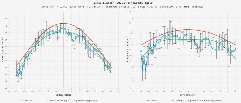 On obtient alors un graphique en deux parties, que j’ai ici généré à partir d’un scan dans la raie H alpha pris le 4 janvier 2026 à 11h39 utc :