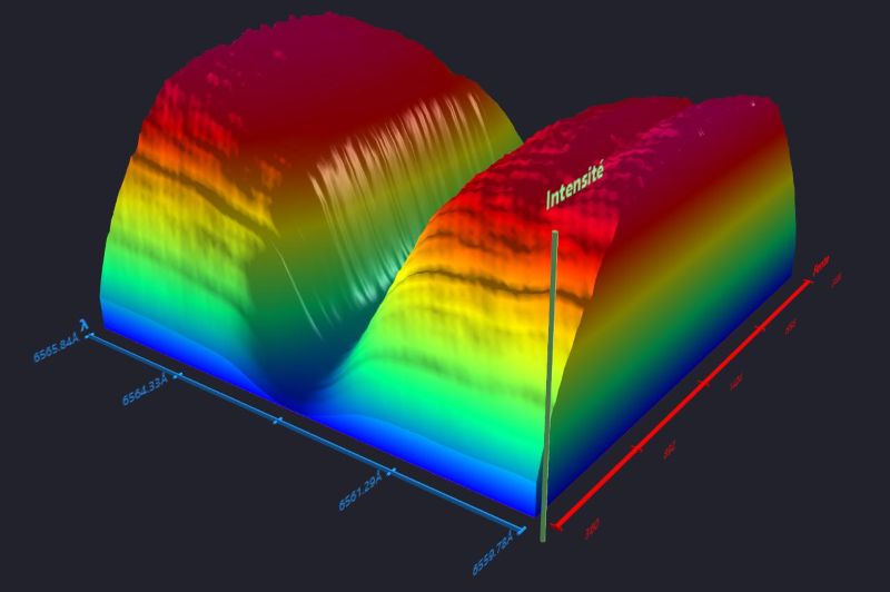 Les amateurs procèdent en pratique à des balayages dans la raie Hydrogène alpha, soit une longueur d’onde de 656,3 nanomètres, soit encore 6563 Angströms. Rappelons qu’un angström est égal à un dixième de nanomètre, lequel représente un millième de microns et donc un millionième de millimètre. Puis l’empilement nous permet d’améliorer la rapport signal/bruit.