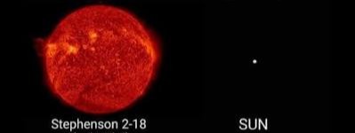 En effet Stephenson 2-18, une étoile de type géante rouge, fait 2150 fois la taille du soleil. Elle dépasserait l’orbite de Saturne si vous la placiez au centre du système solaire! C’est à ce jour la plus grosse étoile découverte dans notre galaxie.