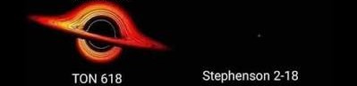 Pour finir avec du démentiel, voyez comment cette géante rouge absolument colossale peut paraitre ridicule si on l’a compare à TON 618 qui a un diamètre environ 180 fois supérieur à celui de Stephenson 2-18.