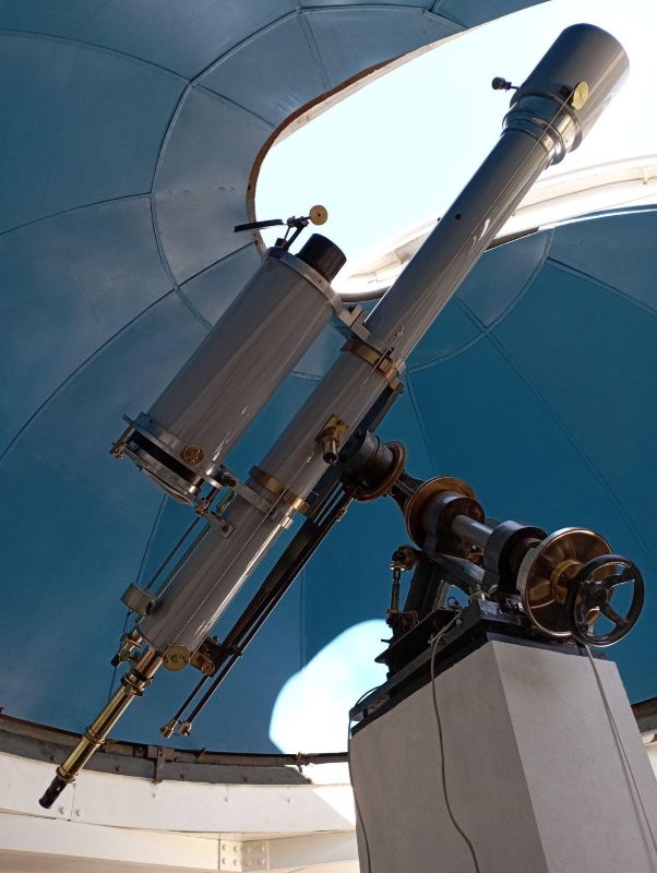 Cette lunette a été construite par M. Manent, fameux constructeur d’instruments astronomiques de l’époque, et elle possède une optique taillée par A. Couder, qui fut le directeur du laboratoire d’optique de l’observatoire de Paris, puis président de l’académie des sciences.