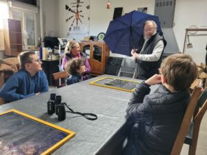 Tout le monde se met aux rangements, nettoyages et petits travaux jusqu’à l’arrivée du groupe. 4 personnes du groupe étant en retard, on repousse la séance de planétarium et l’on démarre avec les animations de base. L’ambiance est sympathique L’apéro autour du pendule de Foucault permet d’accueillir les derniers. Après le casse croûte, séance de planétarium bien interactive puis deux heures d’observation qui ont semblé ravir nos visiteurs. 7 instruments étaient en action pour 10 visiteurs. Faut le faire, merci à tous. L’observatoire a été fermé à 3h36 Espérons que nos fêlés auront réussi à finir cette belle soirée bien plus étoilée que prévu.