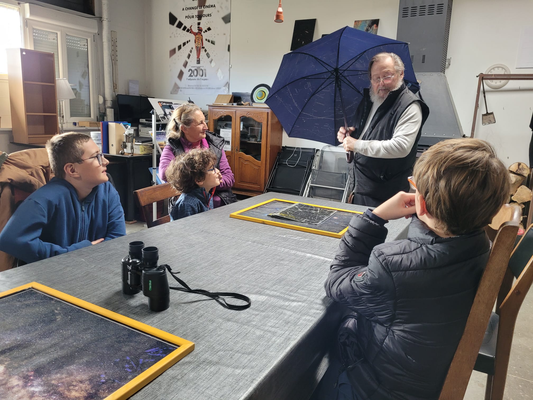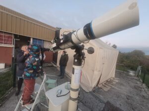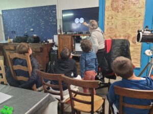 4 jeunes de 7 à 11 ans passionnés et très savants, attentifs de 14h à 19h… Au programme : jeu de rôle pour comprendre les mouvements, les constellations des 4 saisons, le penchant de la Terre et les saisons, l’étoile polaire… Séance de planétarium 1, le Soleil, le système solaire, les galaxies, Curiosity, la Lune… Observation du Soleil avec la Lunette LUNT. Utiliser des jumelles, lunette ou télescope : conseils d’utilisation. Observation du croissant de Lune dans la TAKA. Séance 2 du planétarium, morts des étoiles et début de la conquête spatiale. Observation de Saturne et de la Lune dans la TAKA. On termine par la présentation de STELLARIUM.