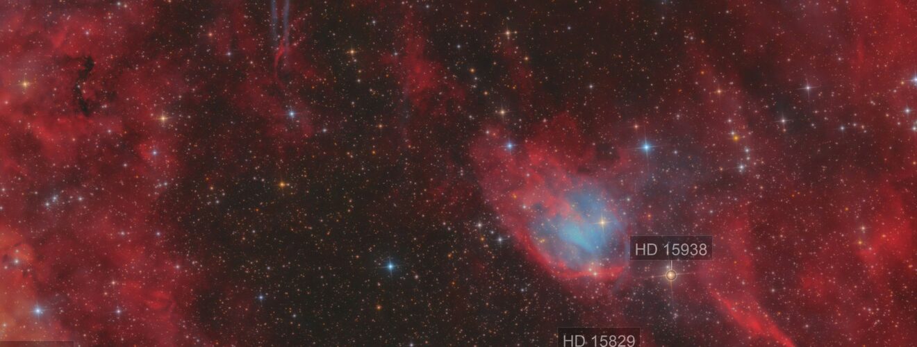 Quand les célèbres découvreurs de nébuleuses planétaires Xavier Strottner (France) et Marcel Drechsler (Germany) m’ont proposé de photographier cet objet situé tout proche de la célèbre nébuleuse du Coeur IC1805, je ne pouvais m’attendre à découvrir une telle beauté, qui avait échappé jusqu’alors aux nombreux clichés de cette région du ciel!